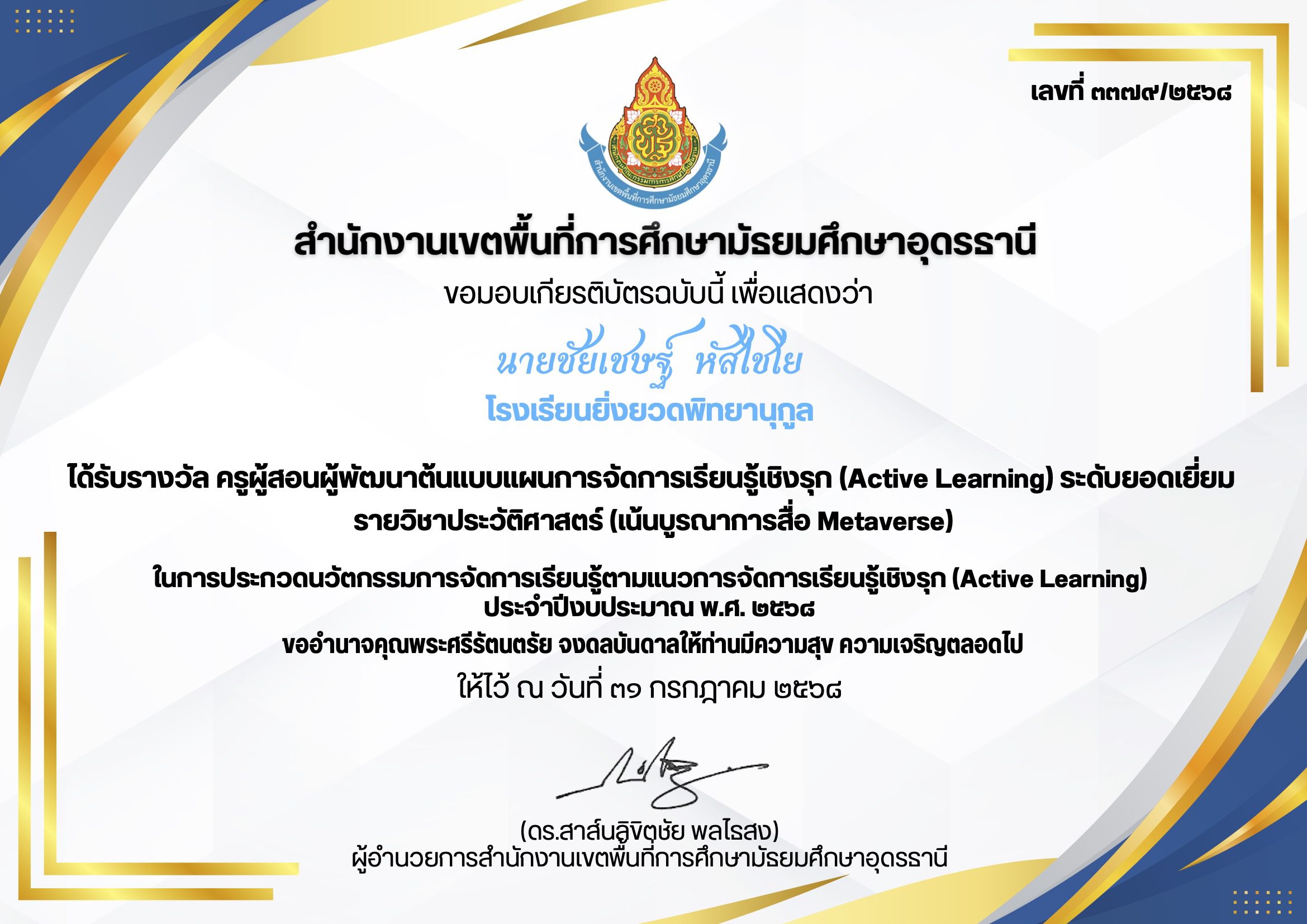 นายชัยเชษฐ์ หัสไชโย โรงเรียนยิ่งยวดพิทยานุกูล ได้รับรางวัล ครูผู้สอนผู้พัฒนาต้นแบบแผนการจัดการเรียนรู้เชิงรุก (Active Learning) ระดับยอดเยี่ยม รายวิชาประวัติศาสตร์ (เน้นบูรณาการสื่อ Metaverse) ในการประกวดนวัตกรรมการจัดการเรียนรู้ตามแนวการจัดการเรียนรู้เชิงรุก (Active Learning) ประจำปึงบประมาณ พ.ศ. ๒๕๖๘ ให้ไว้ ณ วันที่ ๓๑ กรกฎาคม ๒๕๖๘