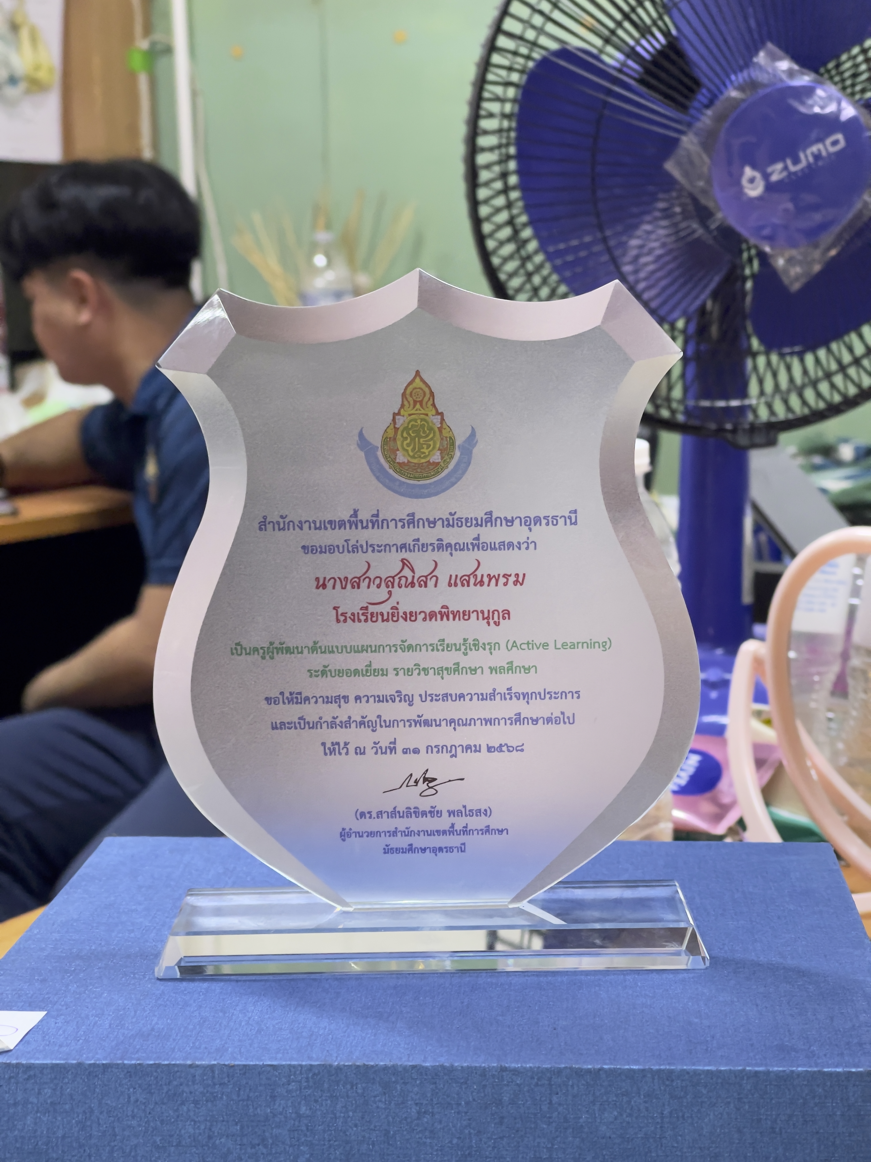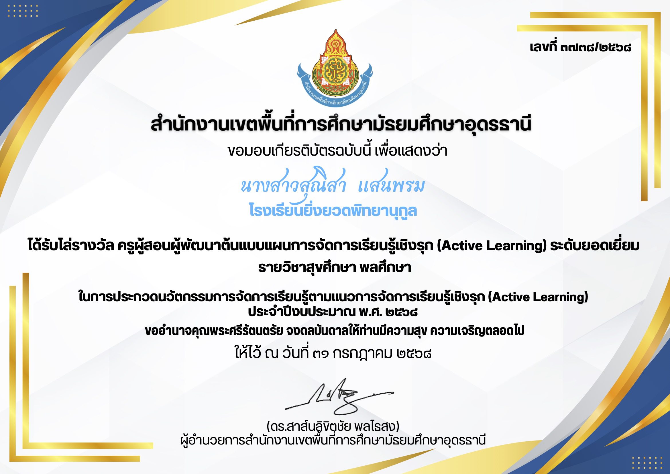 นางสาวสุณิสา แสนพรหม โรงเรียนยิ่งยวดพิทยานุกูล ได้รับโล่รางวัล ครูผู้สอนผู้พัฒนาต้นแบบแผนการจัดการเรียนรู้เชิงรุก (Active Learning) ระดับยอดเยี่ยม รายวิชาสุขศึกษา พลศึกษา ในการประกวดนวัตกรรมการจัดการเรียนรู้ตามแนวการจัดการเรียนรู้เชิงรุก (Active Learning) ประจำปึงบประมาณ พ.ศ. ๒๕๖๘ ให้ไว้ ณ วันที่ ๓๑ กรกฎาคม ๒๕๖๘