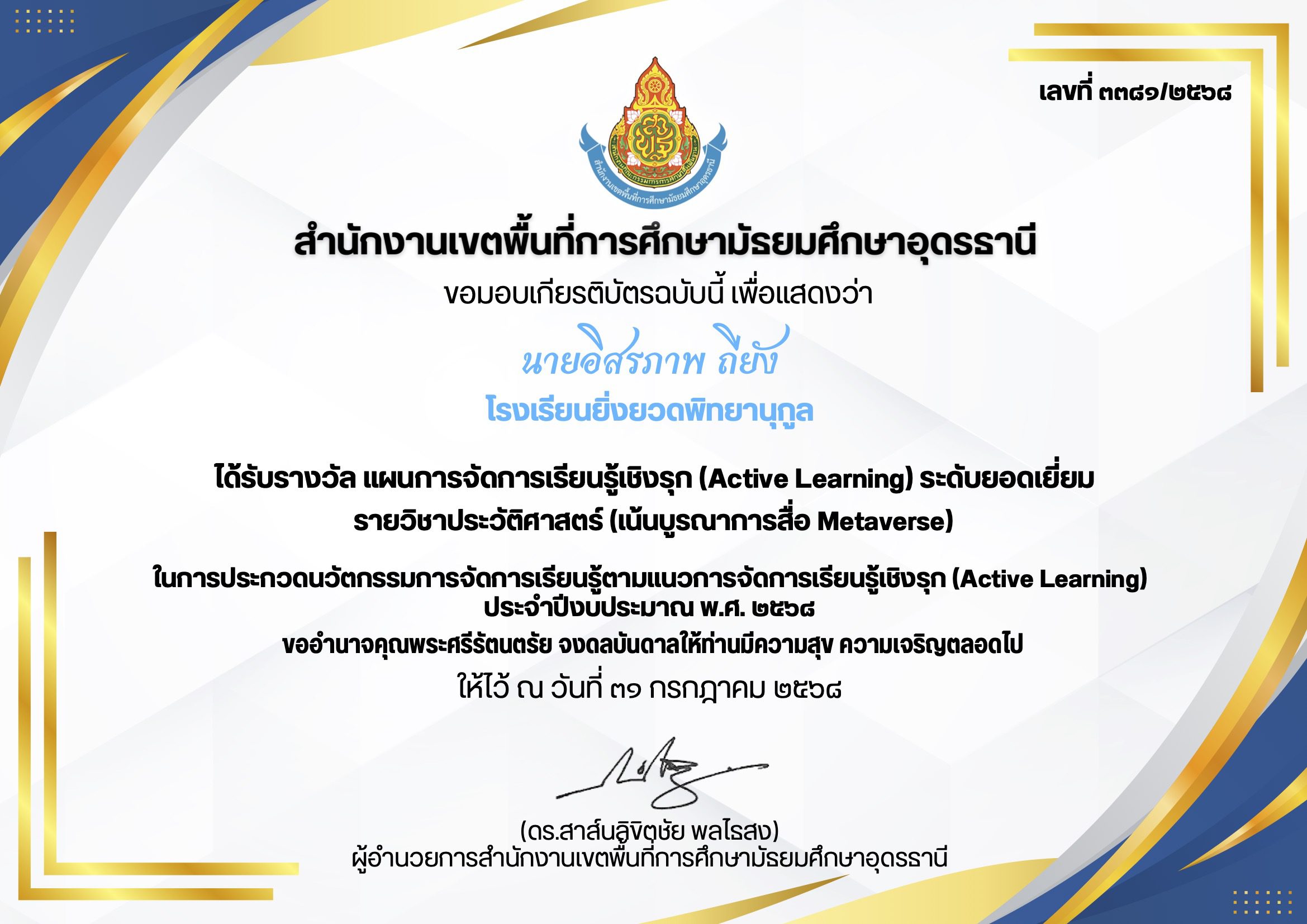 นายอิสรภาพ ถียัง โรงเรียนยิ่งยวดพิทยานุกูล ได้รับรางวัล แผนการจัดการเรียนรู้เชิงรุก (Active Learning) ระดับยอดเยี่ยม รายวิชาประวัติศาสตร์ (เน้นบูรณาการสื่อ Metaverse) ในการประกวดนวัตกรรมการจัดการเรียนรู้ตามแนวการจัดการเรียนรู้เชิงรุก (Active Learning) ประจำปีงบประมาณ พ.ศ. 2568 ให้ไว้ ณ วันที่ 31 กรกฎาคม 2568