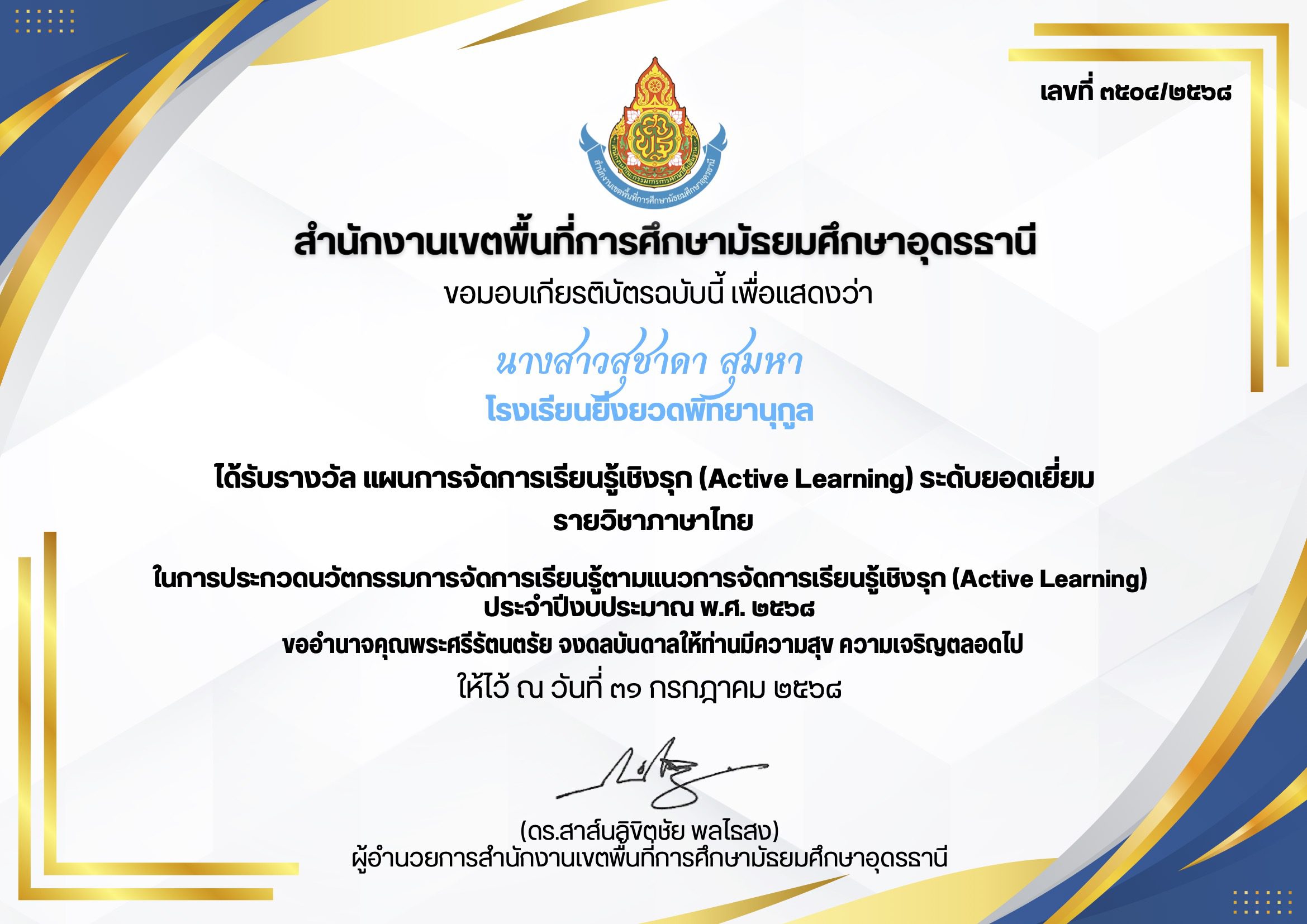 นางสาวสุชาดา สุมหา โรงเรียนยิ่งยวดพิทยานุกูล ได้รับรางวัล แผนการจัดการเรียนรู้เชิงรุก (Active Learning) ระดับยอดเยี่ยม รายวิชาภาษาไทย ในการประกวดนวัตกรรมการจัดการเรียนรู้ตามแนวการจัดการเรียนรู้เชิงรุก (Active Learning) ประจำปีงบประมาณ พ.ศ. 2568 ให้ไว้ ณ วันที่ 31 กรกฎาคม 2568