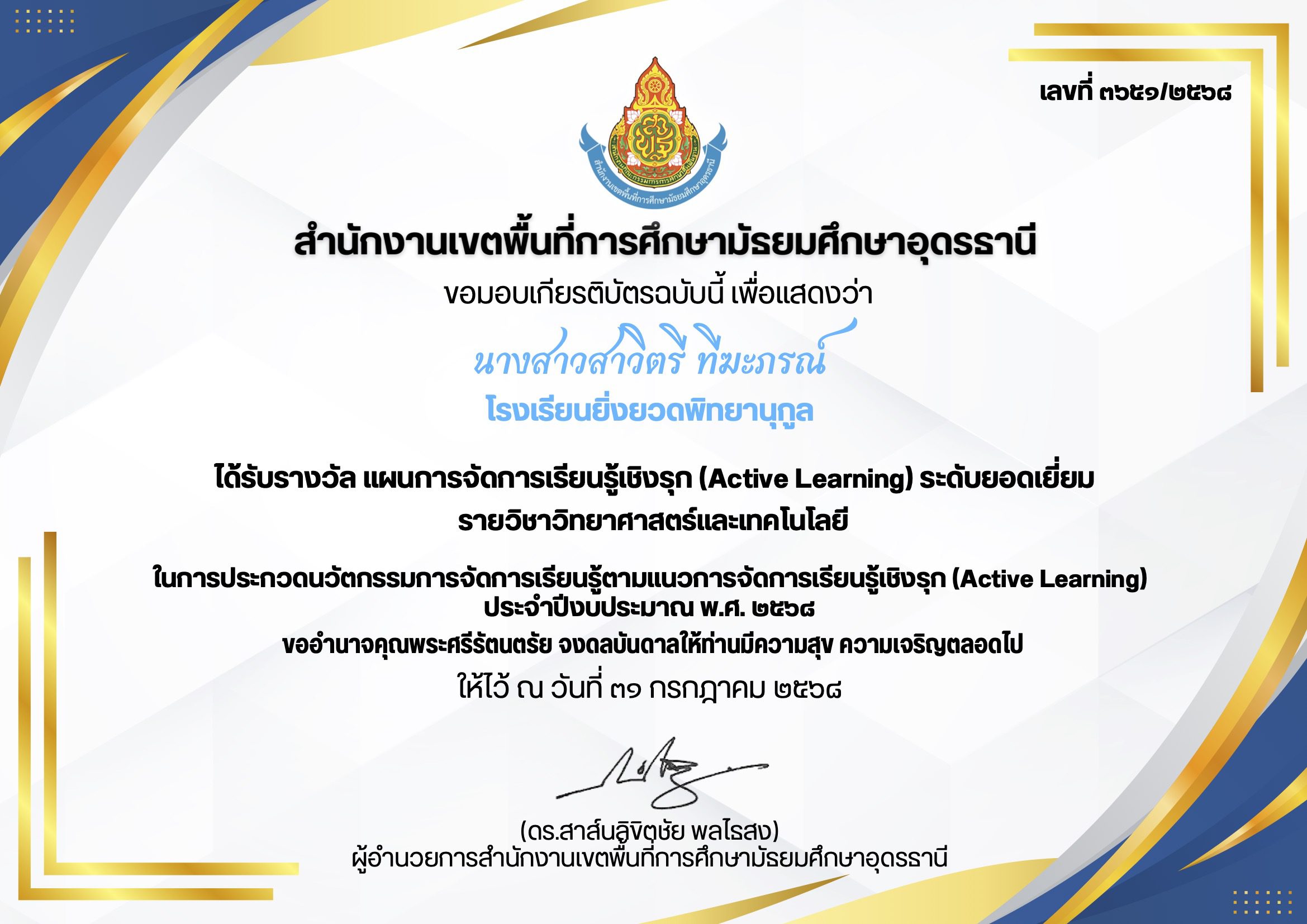 นางสาวสาวิตรี ทีฆะภรณ์ โรงเรียนยิ่งยวดพิทยานุกูล ได้รับรางวัล แผนการจัดการเรียนรู้เชิงรุก (Active Learning) ระดับยอดเยี่ยม รายวิชาวิทยาศาสตร์และเทคโนโลยี ในการประกวดนวัตกรรมการจัดการเรียนรู้ตามแนวการจัดการเรียนรู้เชิงรุก (Active Learning) ประจำปีงบประมาณ พ.ศ. 2568 ให้ไว้ ณ วันที่ 31 กรกฎาคม 2568