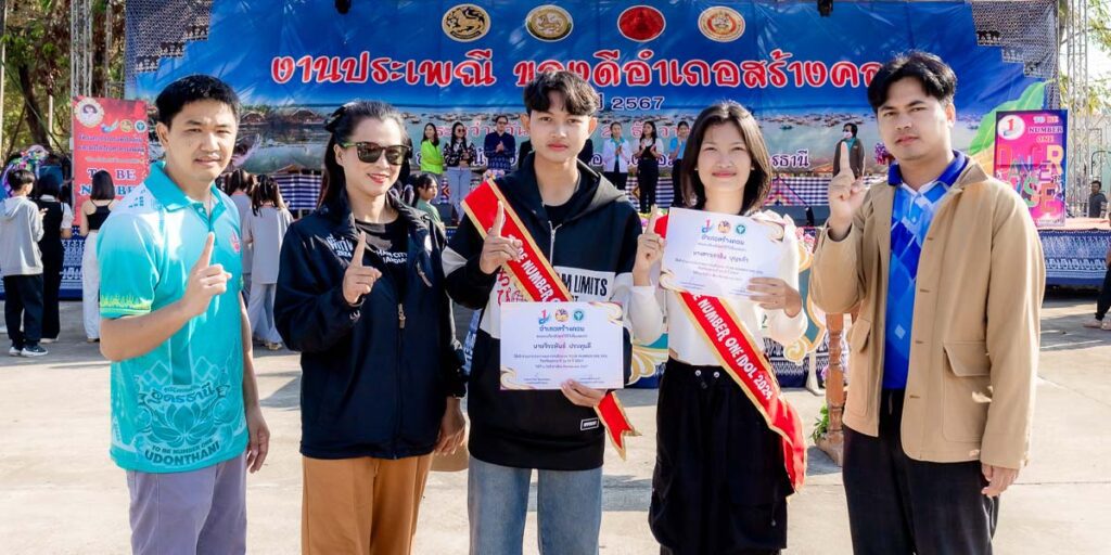 นายจิระพันธ์ ประทุมดี และนางสาวเกวลิน บุญแก้ว ณ เวทีกลางงานประเพณีฯ