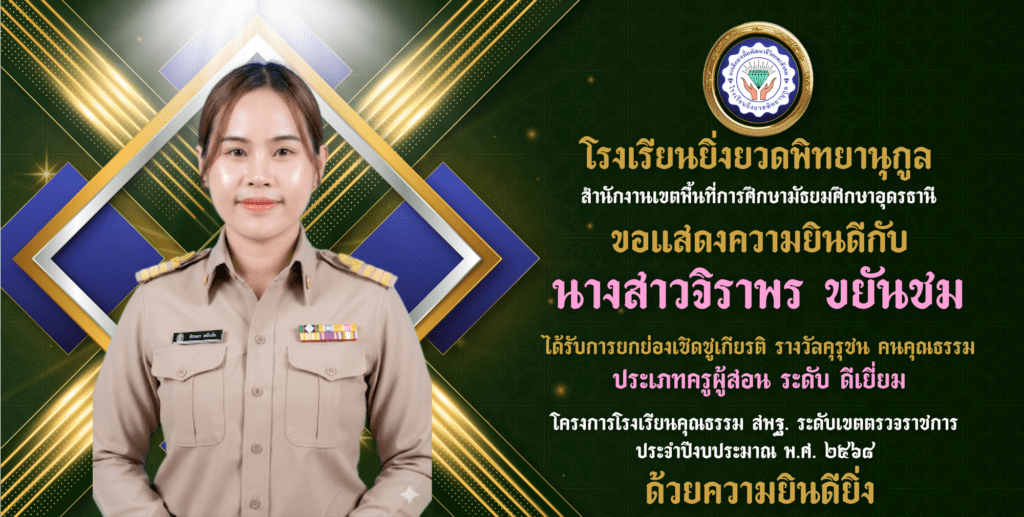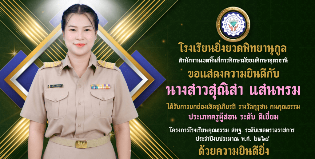 นางสาวสุณิสา แสนพรม ครูโรงเรียนยิ่งยวดพิทยานุกูล ได้รับการยกย่องเชิดชูเกียรติ รางวัลคุรุชน คนคุณธรรม ประเภทครูผู้สอน ระดับ ดีเยี่ยม