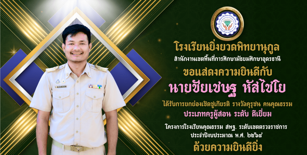 นายชัยเชษฐ์ หัสไชโย ครูโรงเรียนยิ่งยวดพิทยานุกูล ได้รับการยกย่องเชิดชูเกียรติ รางวัลคุรุชน คนคุณธรรม ประเภทครูผู้สอน ระดับ ดีเยี่ยม