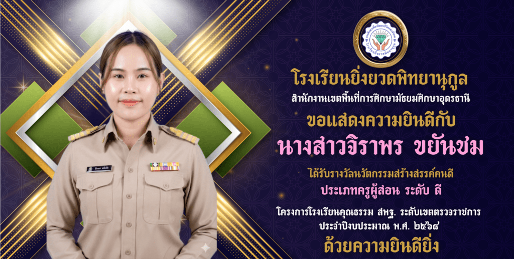 นางสาวจิราพร ขยันชม ครูโรงเรียนยิ่งยวดพิทยานุกูล ได้รับการยกย่องเชิดชูเกียรติ รางวัลคุรุชน คนคุณธรรม ประเภทครูผู้สอน ระดับ ดีเยี่ยม