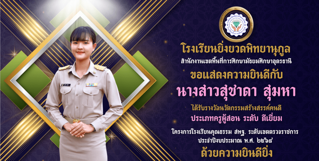 นางสาวสุชาดา สุมหา ครูโรงเรียนยิ่งยวดพิทยานุกูล ได้รับการยกย่องเชิดชูเกียรติ รางวัลคุรุชน คนคุณธรรม ประเภทครูผู้สอน ระดับ ดีมาก