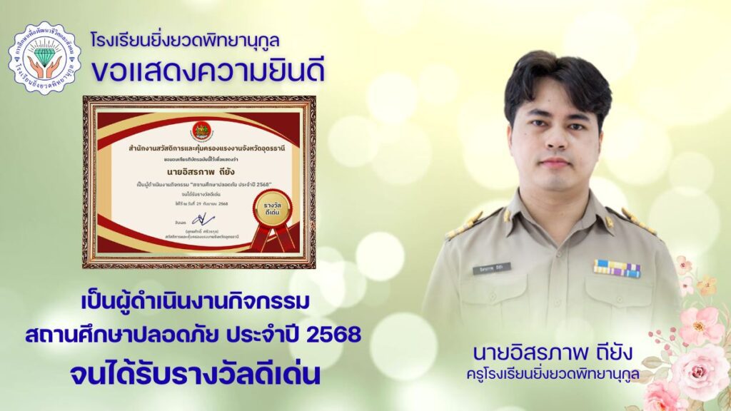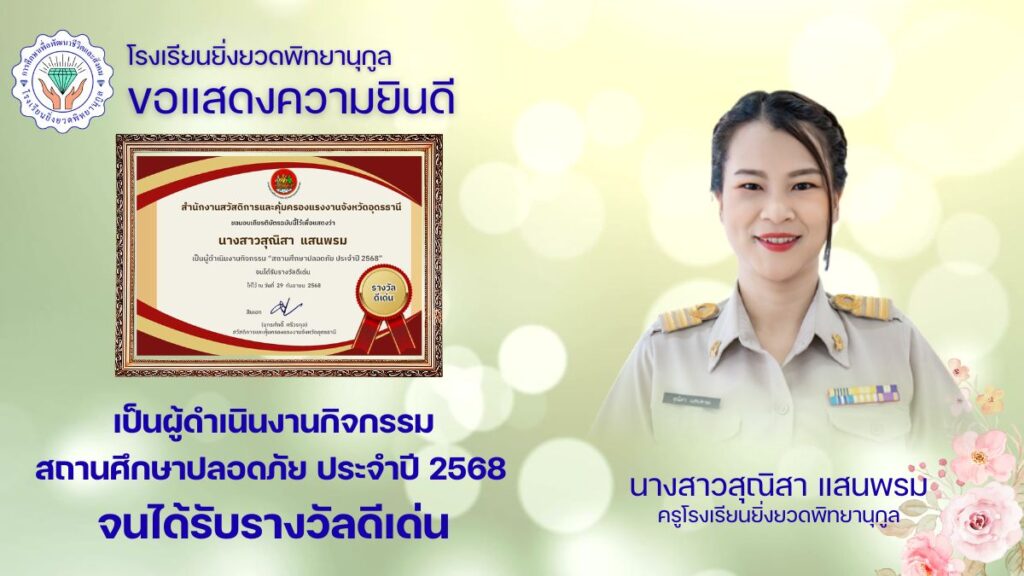 ผู้ดำเนินงานกิจกรรม สถานศึกษาปลอดภัย ประจำปี ๒๕๖๘ ปีที่ ๓ จนได้รับรางวัลดีเด่น
