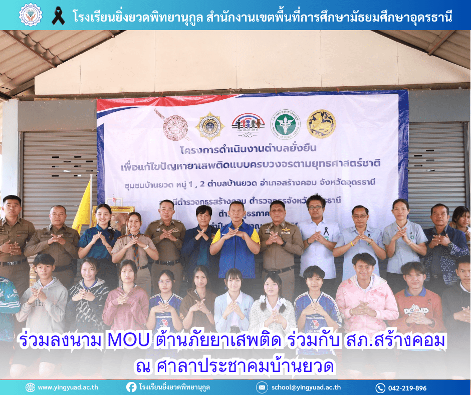ในวันที่ 11 กุมภาพันธ์ พ.ศ.2569 นางสาววิไลวัลย์ พรหมมา ผู้อำนวยการโรงเรียนยิ่งยวดพิทยานุกูล พร้อมด้วยคณะครู นักเรียน ได้เข้าร่วมพิธีลงนามบันทึกข้อตกลงความร่วมมือ (MOU) การป้องกันและแก้ไขปัญหายาเสพติด ร่วมกับ สถานีตำรวจภูธรสร้างคอม (สภ.สร้างคอม) ผู้นำชุมชน และภาคีเครือข่ายที่เกี่ยวข้อง ณ ศาลาอเนกประสงค์หมู่ 1 บ้านยวด