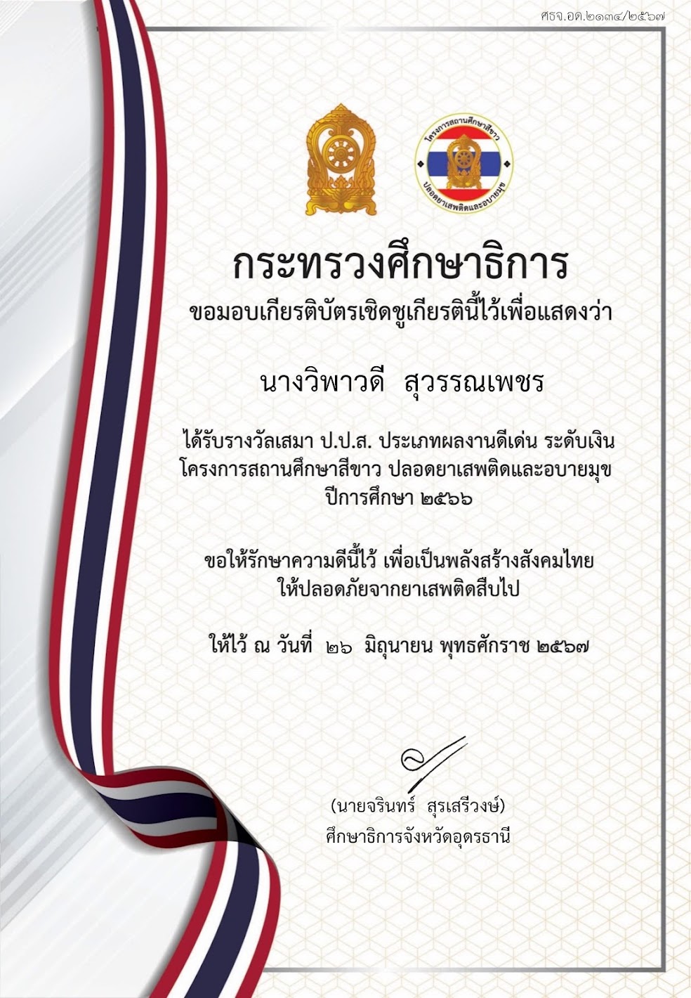ทั้งนี้ ทางสำนักงานเขตพื้นที่การศึกษามัธยมศึกษาอุดรธานี ได้มอบรางวัลให้แก่โรงเรียนยิ่งยวดพิทยานุกูล ในวันที่ ๑๙ กรกฎาคม พ.ศ. ๒๕๖๗ ณ การประชุมผู้บริหารสถานศึกษา สำนักงานเขตพื้นที่การศึกษามัธยมศึกษาอุดรธานี ครั้งที่ ๕/๒๕๖๗ ณ ห้องประชุมพุทธรักษา สำนักงานเขตพื้นที่การศึกษามัธยมศึกษาอุดรธานี โดยมี ดร.สาส์นลิขิตชัย พลไธสง ผู้อำนวยการสำนักงานเขตพื้นที่การศึกษามัธยมศึกษาอุดรธานี เป็นประธานมอบรางวัล และ นางวิพาวดี สุวรรณเพชร ผู้อำนวยการโรงเรียนยิ่งยวดพิทยานุกูล เป็นผู้รับรางวัล
