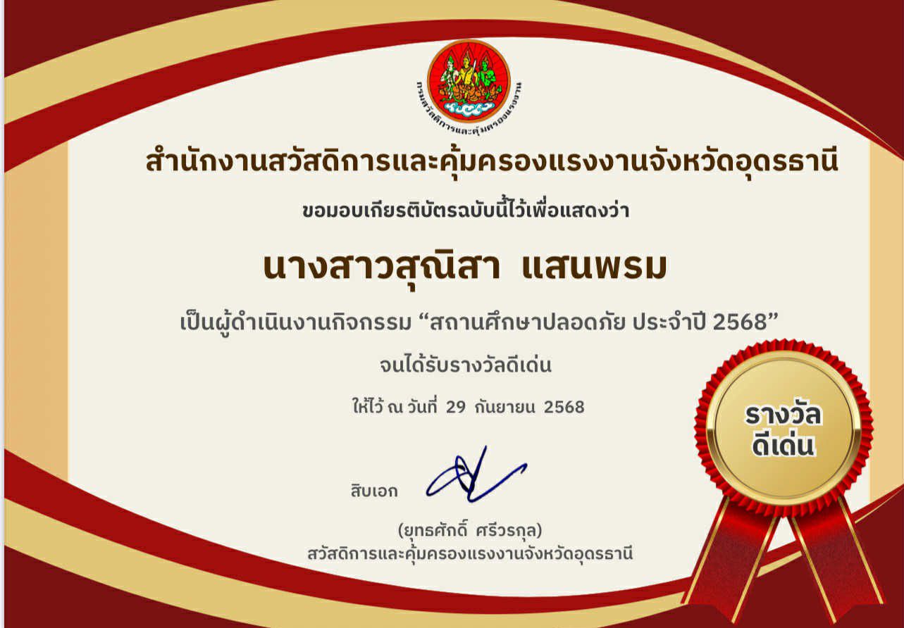 นางสาวสุณิสา แสนพรม ครูโรงเรียนยิ่งยวดพิทยานุกูล เป็นผู้ดำเนินงานกิจกรรม สถานศึกษาปลอดภัย ประจำปี ๒๕๖๘ ปีที่ ๓ จนได้รับรางวัลดีเด่น