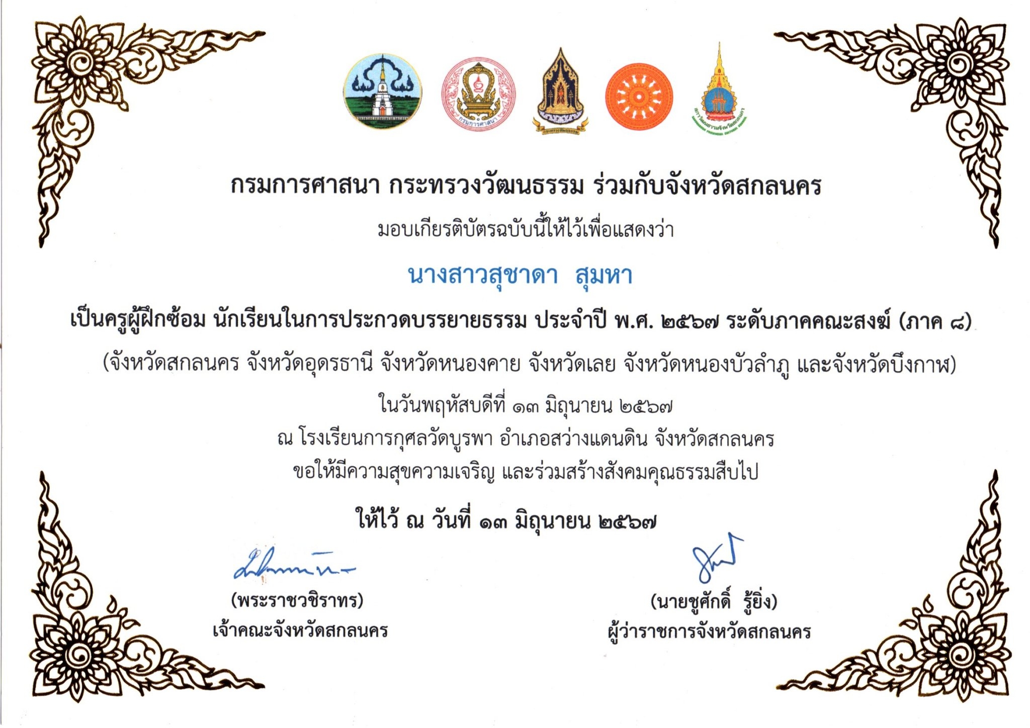 นางสาวสุชาดา สุมหา ครูกลุ่มสาระการเรียนรู้ภาษาไทย ได้รับรางวัลเป็นครูผู้ฝึกซ้อม นักเรียนในการประกวดบรรยายธรรม ประจำปี พ.ศ. ๒๕๖๗ ระดับภาคคณะสงฆ์ (ภาค ๘) (จังหวัดสกลนคร จังหวัดอุดรธานี จังหวัดหนองคาย จังหวัดเลย จังหวัดหนองบัวลำภู และจังหวัดบึงกาฬ)ในวันพฤหัสบดีที่ ๑๓ มิถุนายน ๒๕๖๗ จากกรมการศาสนา กระทรวงวัฒนธรรม ร่วมกับจังหวัดสกลนคร ณ โรงเรียนการกุศลวัดบูรพา อำเภอสว่างแดนดิน จังหวัดสกลนคร